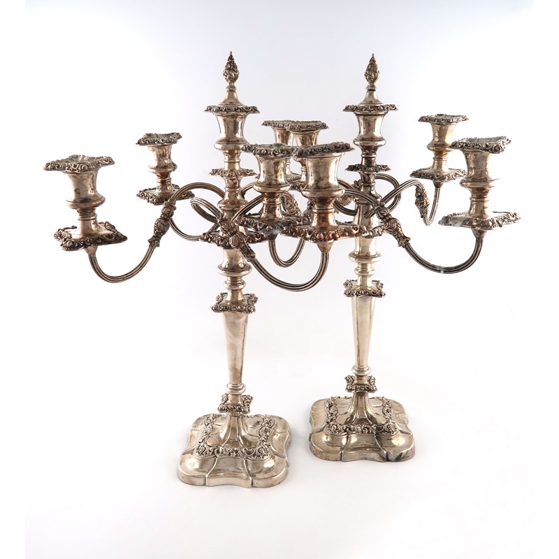 tapering circular columns, foliate scroll shoulders, spool shaped capitals, with four reeded and foliate scroll arms, each supporting a capital, and with a central light, with a detachable flame finial, on raised shaped square bases with a foliate scroll border, height 54.8cm, approx. weight of branches 130oz. (2)