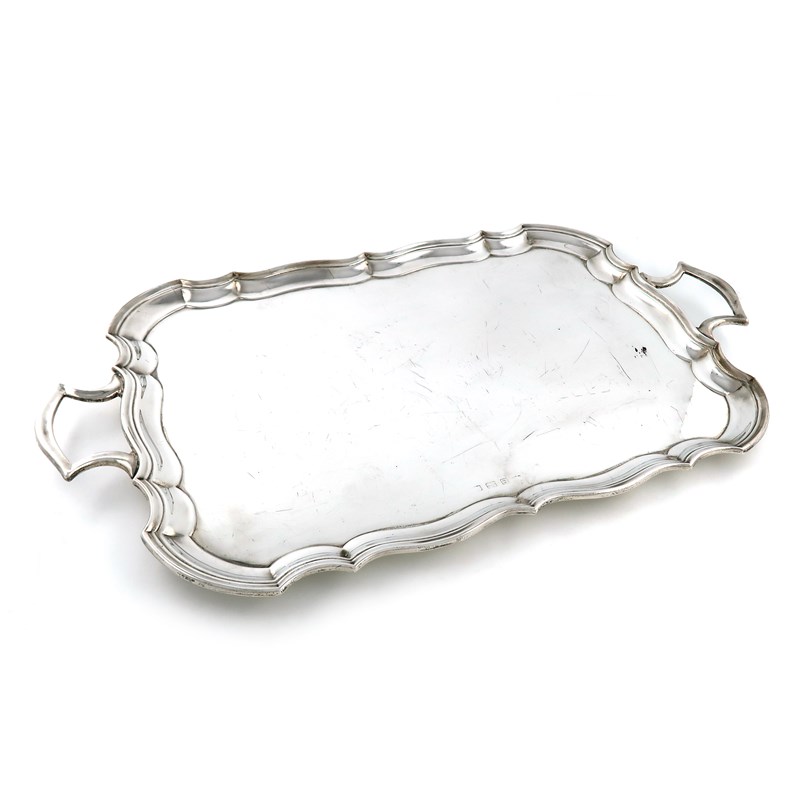 shaped rectangular form, moulded border, plain handles, length handle to handle 69cm, approx. weight 120oz.