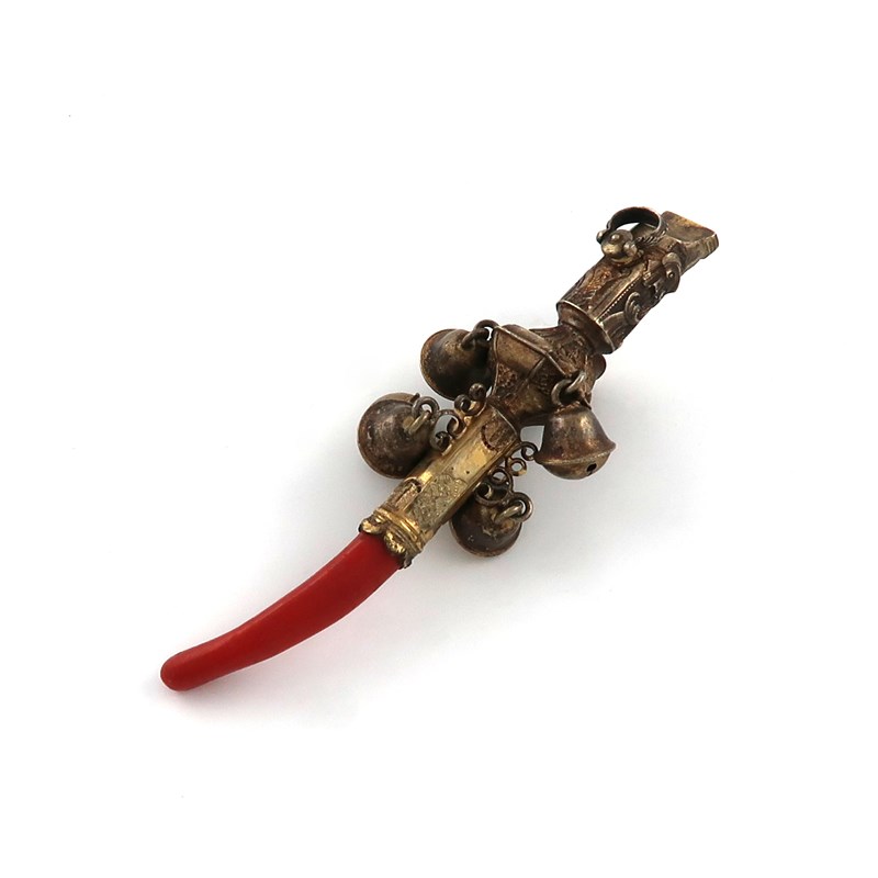 hexagonal baluster form, chased foliate decoration, with a hinged loop and six bells, and with a coral teether, length 13.5cm.