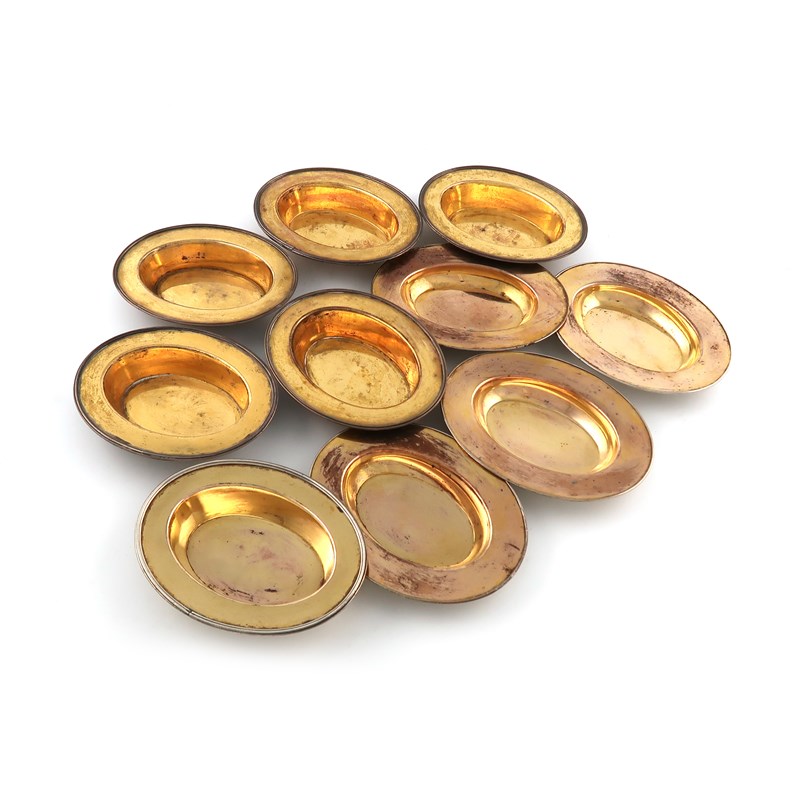 oval form, gilded bowls, some with reeded borders, length 11.7cm. (10)