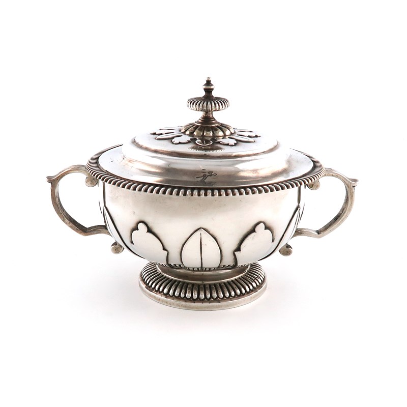 circular form, scroll handles, cut-card decoration, the cover with a crest and fluted finial, on a raised circular foot, diameter 12cm, approx. weight 20oz.