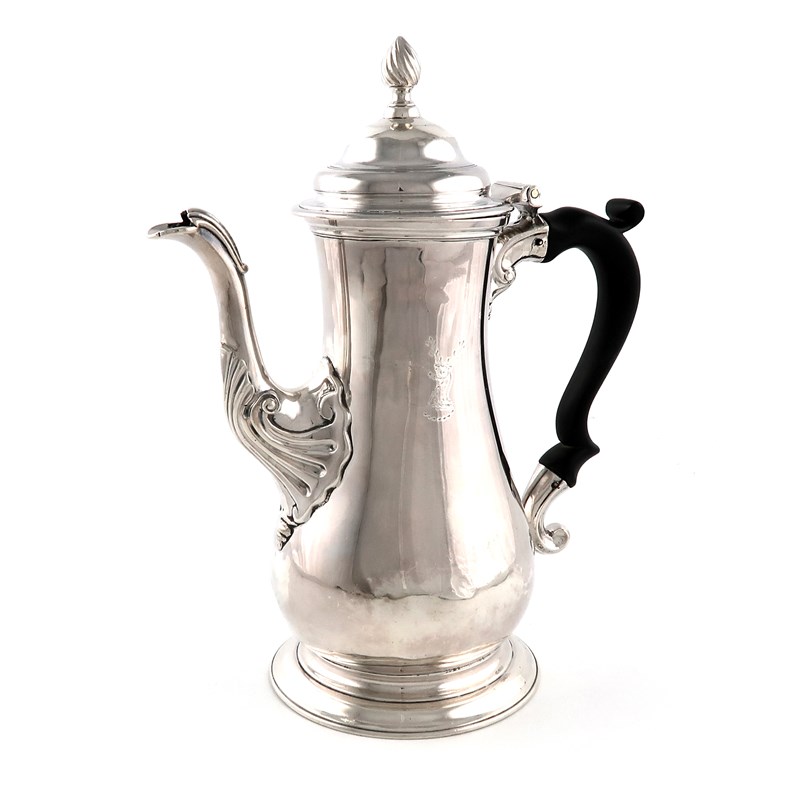 baluster form, scroll handle, domed hinged cover with a flame finial, on a raised circular foot, engraved with a crest, height 24.7cm, approx. weight 24.5oz.