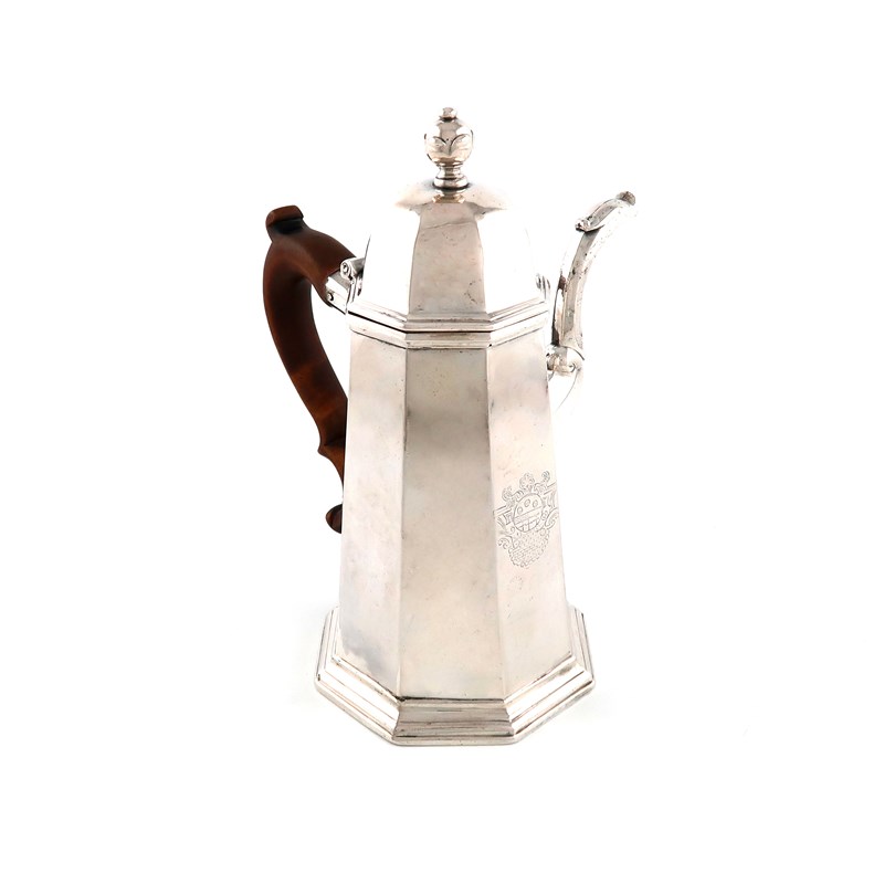 tapering octagonal form, faceted spout, wooden scroll side handle, domed cover with a knop finial, engraved with an armorial, height 22.8cm, approx. weight 26.5oz.