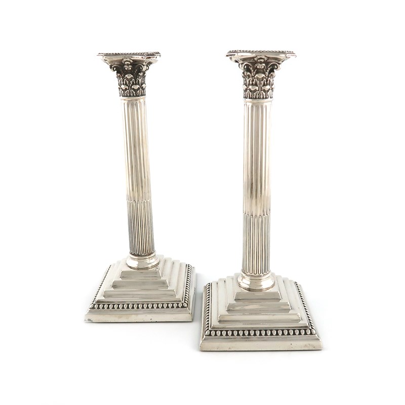 Corinthian column form, beaded borders, on stepped square bases, with a presentation inscription, height 29cm.