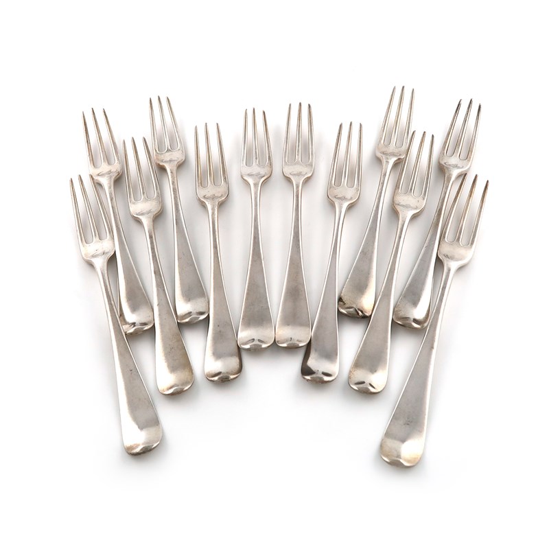 A set of twelve George III silver three-pronged Hanoverian pattern table forks