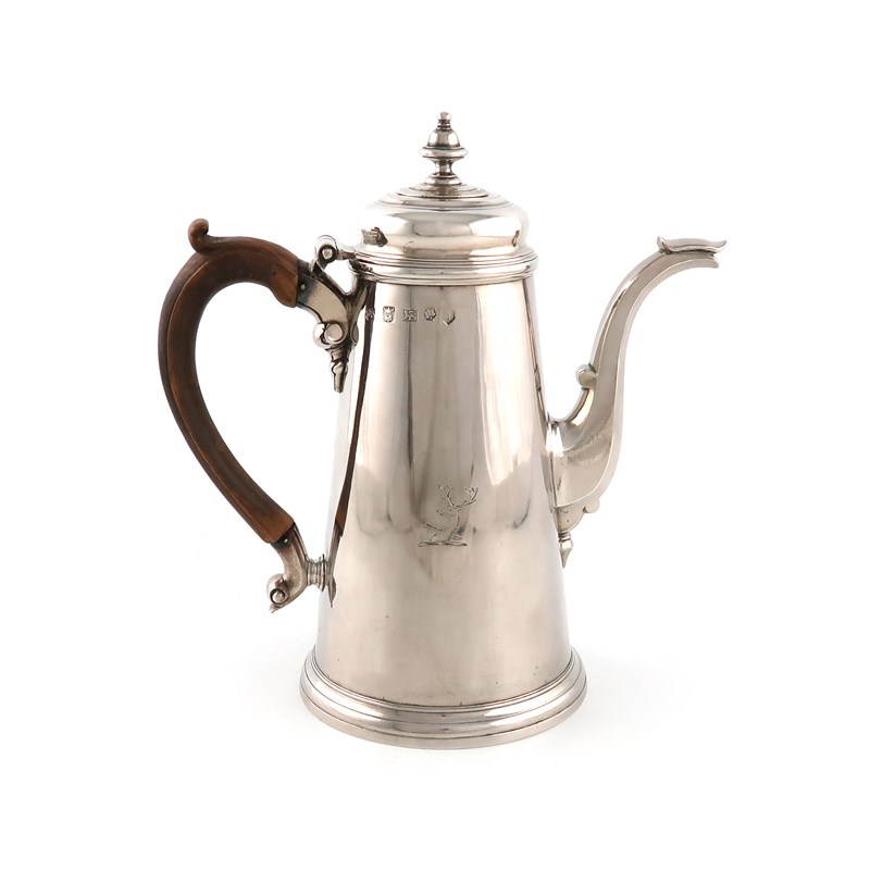 tapering circular form, wooden scroll handle, faceted spout, the slightly domed cover with a unmarked pull-out knop finial, on a circular foot, engraved with a crest, height 21cm, approx. weight 20oz.