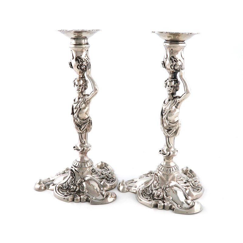 A matched pair of George II silver caryatid candlesticks