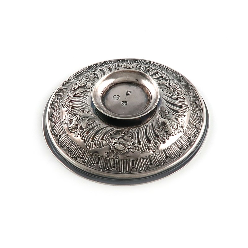 slightly raised circular form, with chased foliate and rocaille decoration, diameter 11cm, approx. weight 2.8oz.