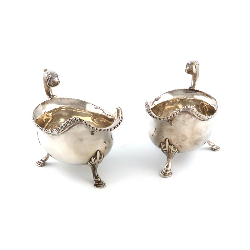 oval form, gadroon border, leaf capped scroll handle, on three shell capped hoof feet, length 18.5cm, approx. weight 19oz. (2)