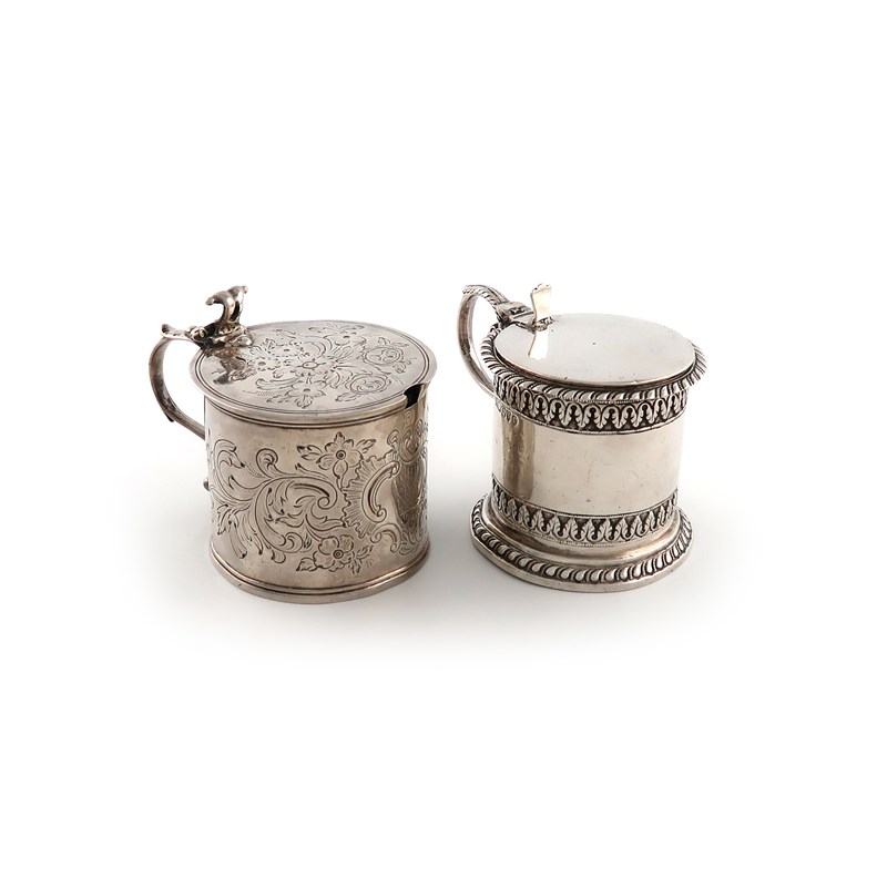 circular form, chased foliate borders and with a stylised gadroon border, height 7.3cm, plus a George III silver mustard pot, London 1770, circular form, chased foliate decoration, with a blue glass liner, approx. total weight 8.5oz. (2)