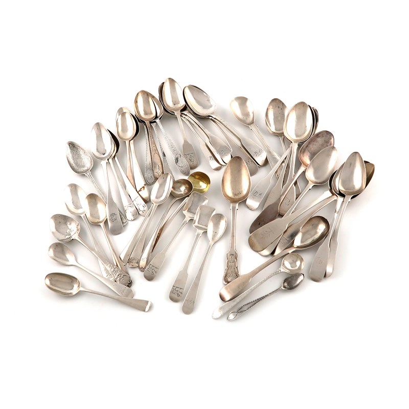 comprising: a miniature Bright-cut spoon, by Michael Keating, a set of five teaspoons, twenty-eight further teaspoons, a Cork teaspoon by Terry and Williams, two egg spoons, and seven condiment spoons, approx. weight 19.5oz. (qty)