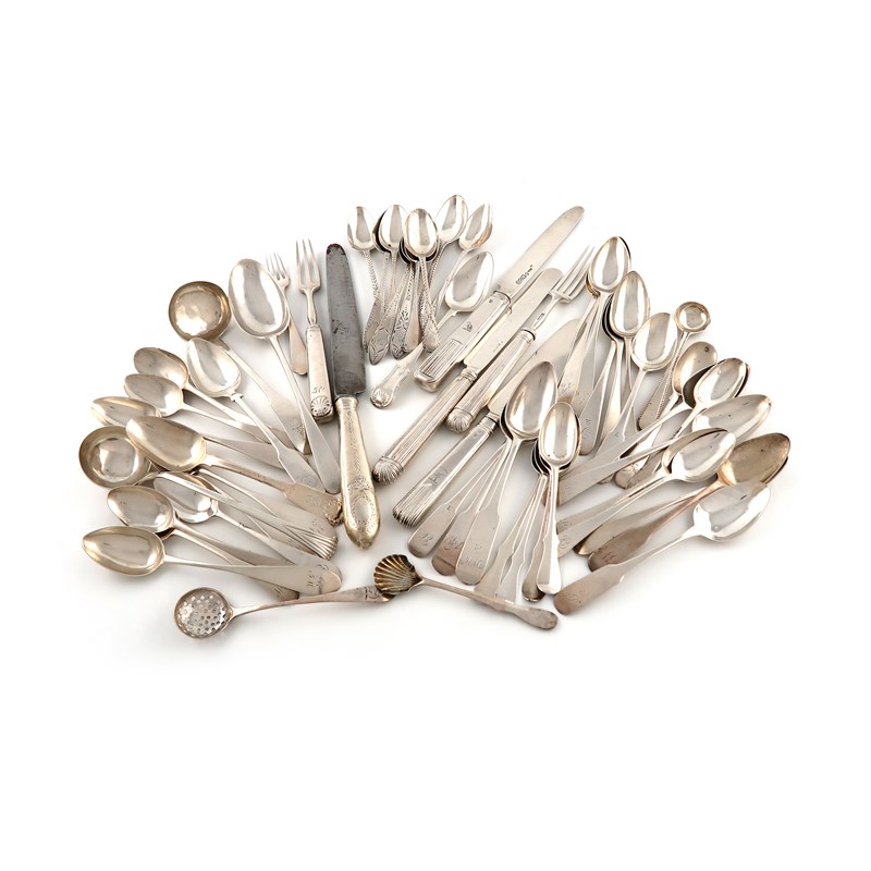 comprising: two toddy ladles, a small fork, a tablespoon, an egg spoon, three condiment spoons, three fruit knives and two forks, a set of six teaspoons, thirty-seven teaspoons, and a table knife, approx. weighable 23.4oz. (qty)