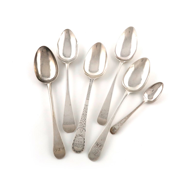 all Jersey, comprising: five tablespoons, by John Le Gallais, Jacques Quesnel, Charles William Quesnel, George Hamon, and one by the maker LC, unidentified, plus a Bright-cut teaspoon by the same maker, approx. weight 7.2oz.