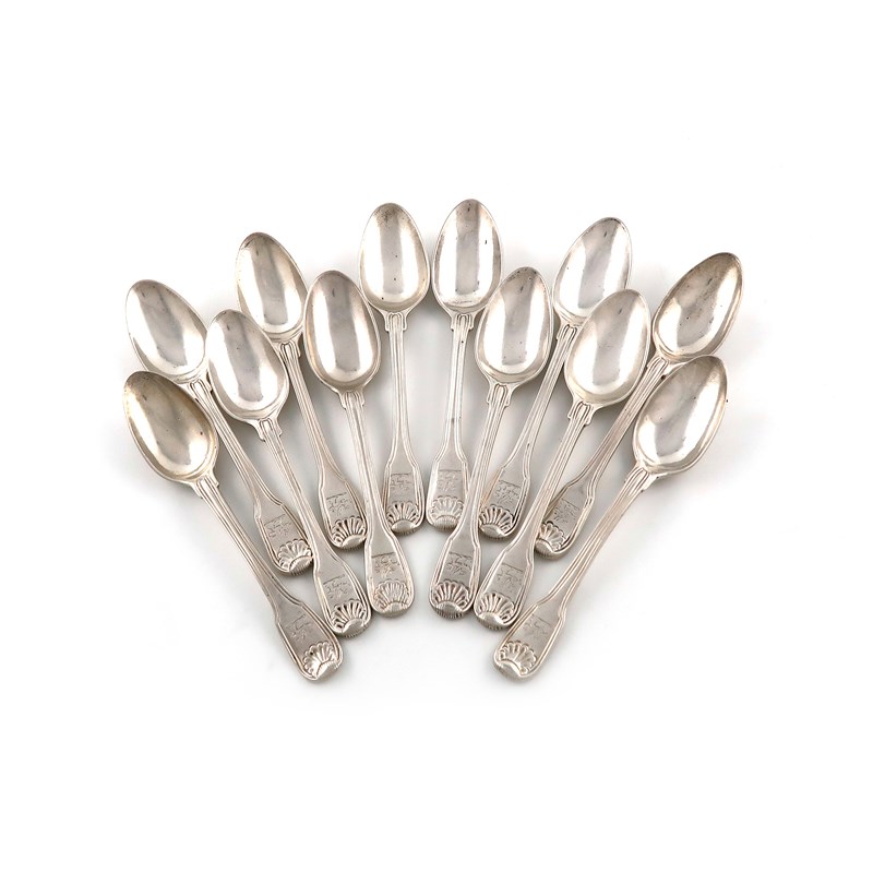 A matched set of twelve George III silver Fiddle, Thread and Shell pattern teaspoons,
