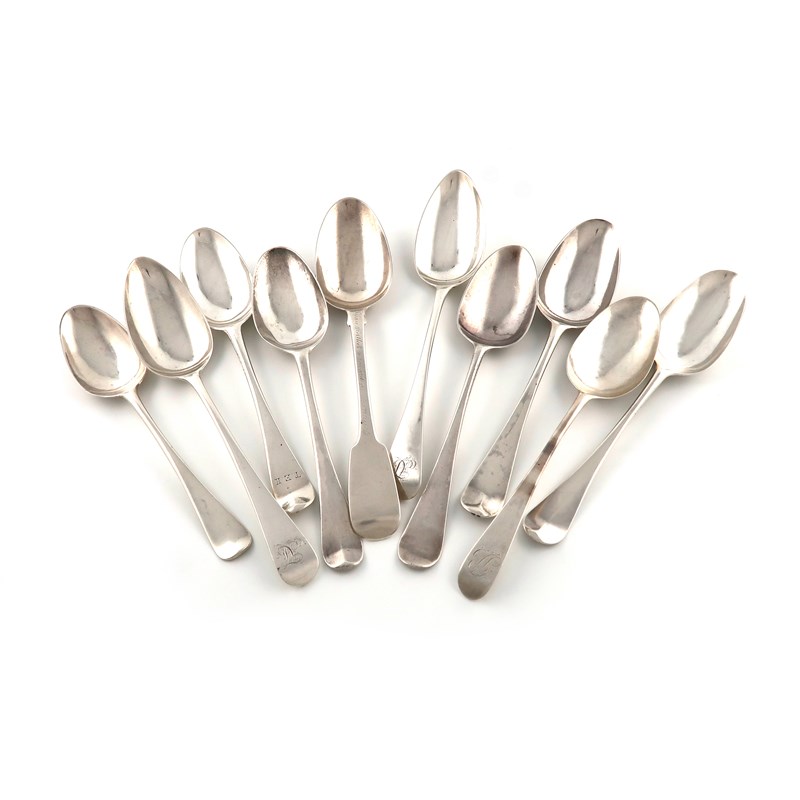 A collection of ten antique silver tablespoons with inscriptions