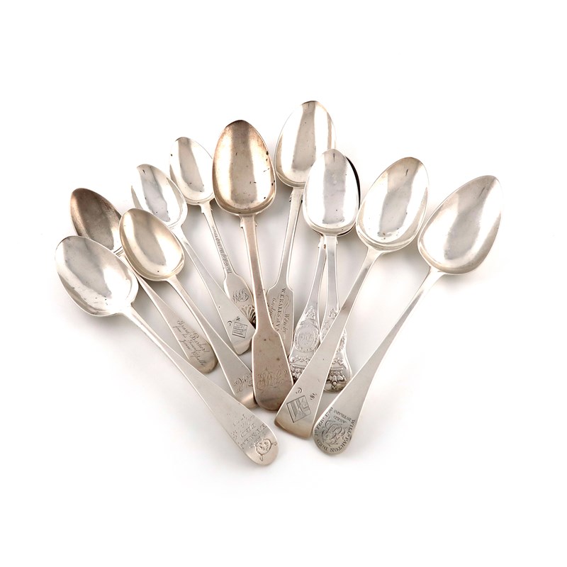 The inscription include: 'The Gift of the Ship Grace', 'Won by W. E. Bale at Vauxhall Gardens, Yarmouth, 4 July 1848', 'Keys Gracechurch Sir'. 'I. B. H Ram Hotel', 'Gerard Barker from his Friend Jerome Viasalli', one engraved with a skull and cross bones and inscribed E. Y. M. Esq. Died April 10th 1778', plus three others and two private-die dessert spoons, the reverse inscribed 'White grapes' , approx. weight 18.4oz. (qty)