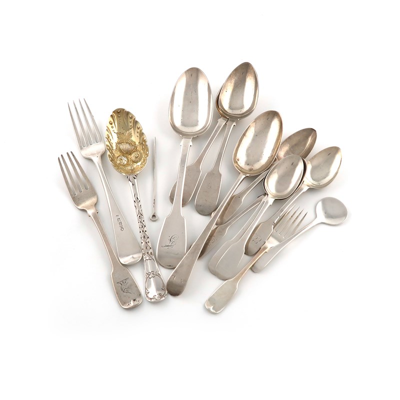 comprising: two tablespoons, a tablespoon with later berry decoration, a table fork, marked on the top surface of the terminal, a dessert fork, a small fork, two dessert spoons, a teaspoon, a salt spoon with a flattened bowl, and a poultry skewer, approx. weight 16oz. (qty)