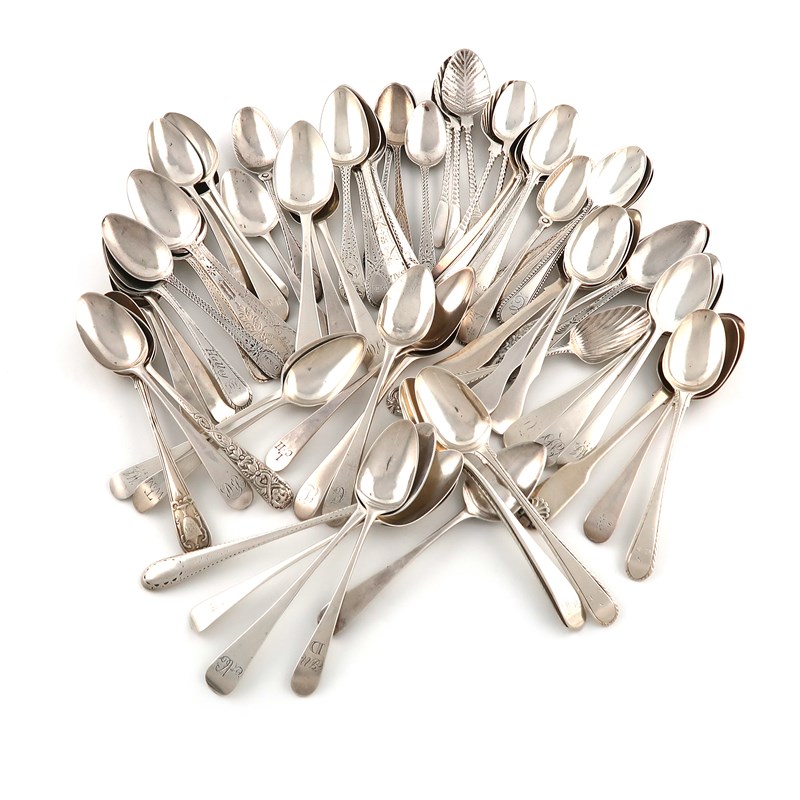 A large collection of silver teaspoons