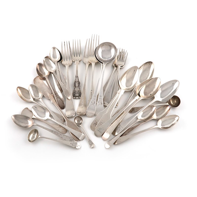 comprising: a pair of sauce ladles, by Langlands and Robertson, two table forks marked on the top surface of the terminal, another table fork, four dessert forks, six dessert spoons, a butter knife, four condiment spoons, a miniature spoon and thirteen teaspoons, approx. weight 28.9oz. (qty)