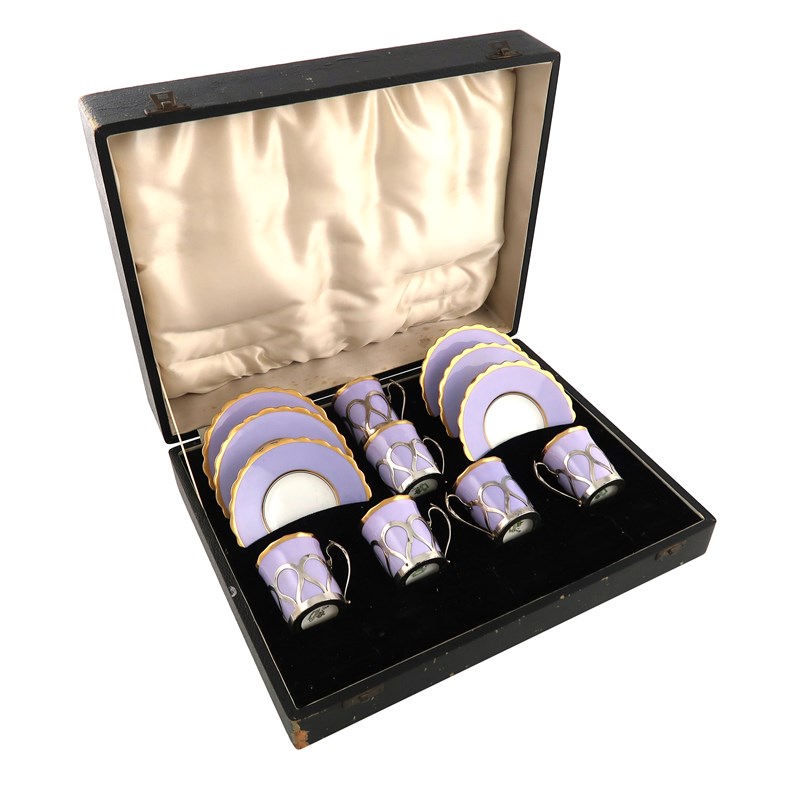 A set of six silver-mounted ceramic coffee cups and saucers,
