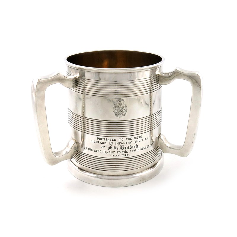 tapering circular form, with three bands of reeded decoration, plain handles, engraved with the badge and inscribed 'Presented to The Mess Highland Lt. Infantry (Militia), by F.G. Kinloch on his appointment to the 92nd Highlanders, June 1874', height 16.8cm.