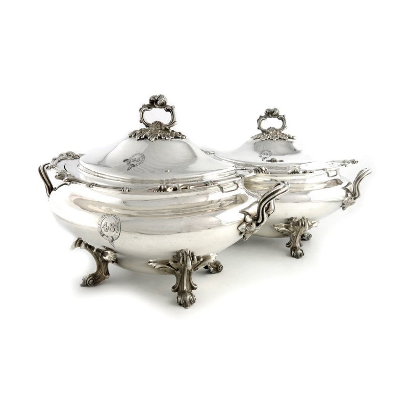 oval bellied form, foliate scroll handles and borders, engraved with the regimental badge, domed covers with foliate handles, on four scroll capped scroll feet, length handle to handle 39.5cm. (2)