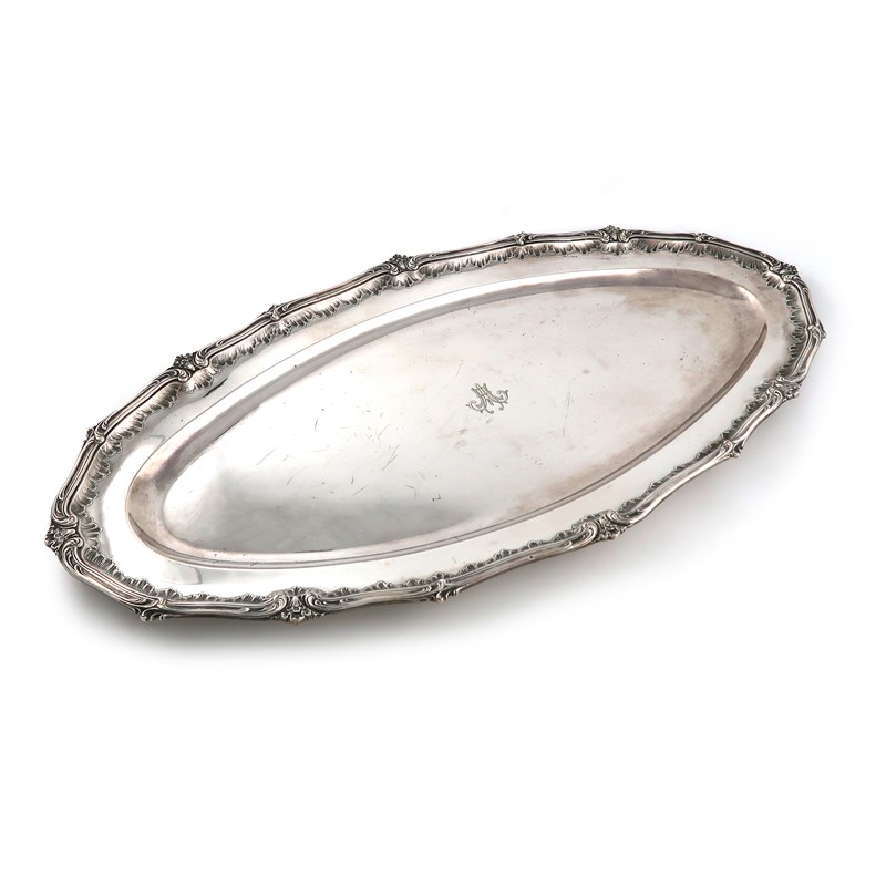elongated oval form, shell and scroll border and with rocaille decoration, the centre with a monogram, length 71.3cm, approx. weight 93oz.
