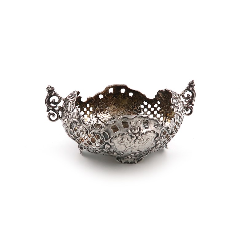 oval form, caryatid scroll handles, the body embossed with figures and foliate scroll motifs and pierced with trellis decoration, on four bracket feet, length handle to handle 16cm, approx. weight 5.5oz.