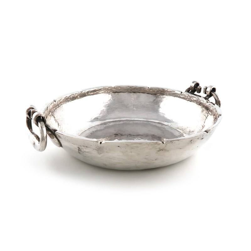 shallow circular form, spot-hammered decoration, drop ring handles, diameter 26cm.