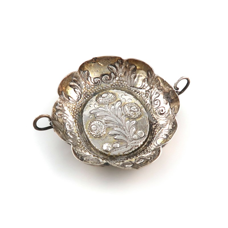 lobed oval form, embossed with flowers and foliate scroll decoration, plain wire-work scroll handles, length 10cm, approx. weight 1.3oz.