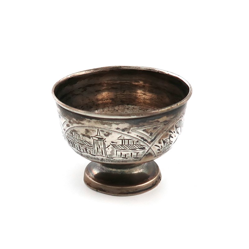 circular form, engraved with a town scene and foliate decoration, on a circular foot, diameter 5.4cm, approx. weight 1oz.