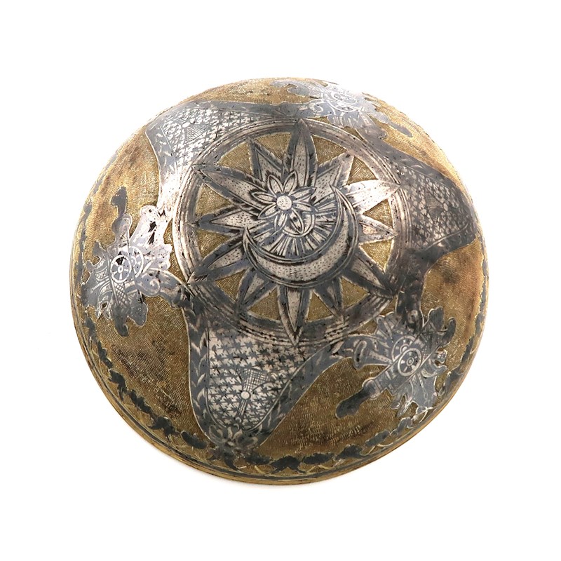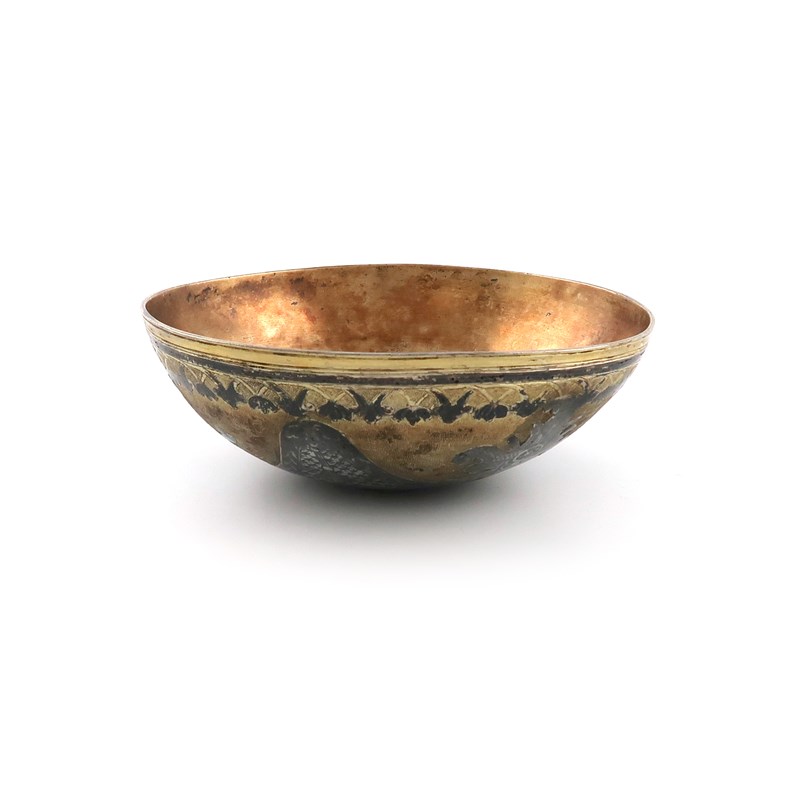 tapering circular bowl, decorated with weapons and foliate decoration, on a matted ground, diameter 14.4cm, approx. weight 9.6oz.