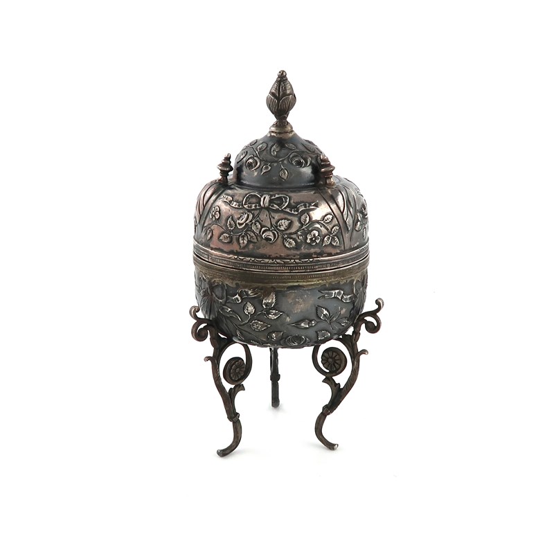 circular form, embossed foliate decoration, the pull off cover with a cone finial, on three scroll legs, height 19cm, approx. weight 7oz.