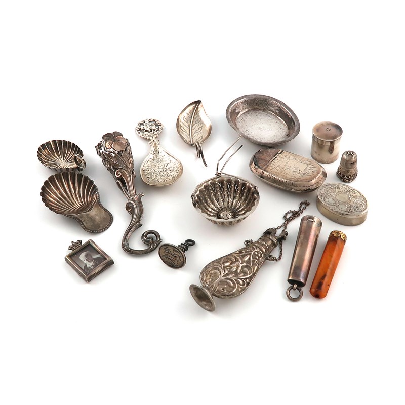 comprising: a George III leaf shaped caddy spoon, by Joseph Taylor, Birmingham 1800, two further caddy spoons, a Victorian pot and cover, London 1847, the cover and side initialled 'B', a snuff box, the cover engraved with a man and horse, (a.f), a tea strainer, a modern vinaigrette, a small photograph frame, a George III frame, London 1792, a cigarette holder and case, a thimble, a dish, plus an unmarked scent flask, a posy holder and an old Sheffield plated caddy spoon, approx. weighable 5oz. (qty)