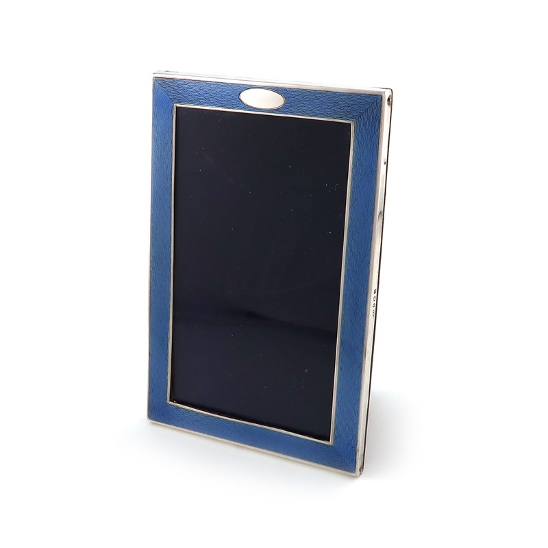 upright rectangular form, the blue enamel on an engine-turned ground, with an oval cartouche, wooden easel back, height 19.4cm.