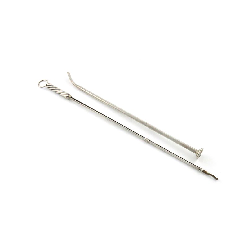 swirl fluted handle with a ring attachment, slender slide-action cylindrical stem, length 33.8cm, plus an Edwardian silver candelabra douser, by S. Mordan and Co., Chester 1908, curved cylindrical form, with a mouth-piece, length 30cm, approx. weight 1.8oz. (2)
