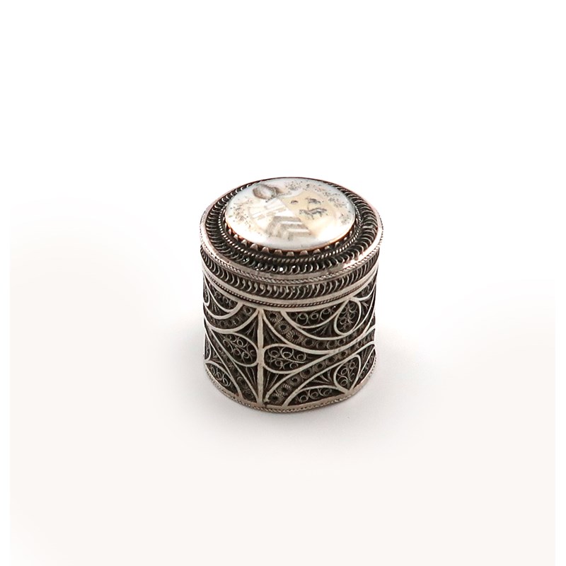 cylindrical form, the pull off cover with an armorial under glass, height 3cm.