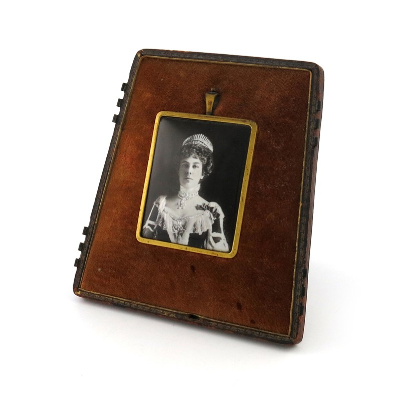 rectangular form, in formal dress with a tiara, plain gilt metal frame with a ring attachment, in a velvet lined frame with an easel back, length 8.2cm.