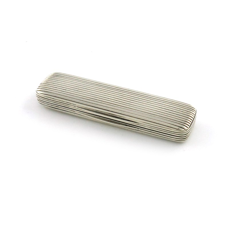 rectangular form, reeded decoration, the interior with a mirror, (cracked), length 8.5cm, approx. weight 1.2oz.