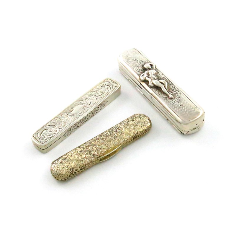 including: a French one of rounded rectangular form, hinged cover and base, with engine-turned decoration and applied with a female figure, plus a French silver-gilt example with chased foliate decoration and a Dutch box, 1859, engraved foliate decoration, approx. weight 3oz. (3)