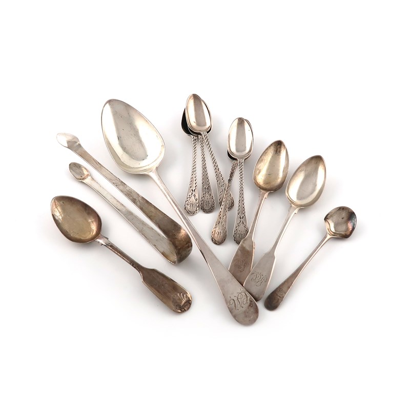 comprising: a set of five Bright-cut teaspoons, by Langlands and Robertson, the terminals initialled, a tablespoon by Dorothy Langlands, 1806, an egg spoon, three teaspoons and a pair of sugar tongs, approx. total weight 7oz. (11)
