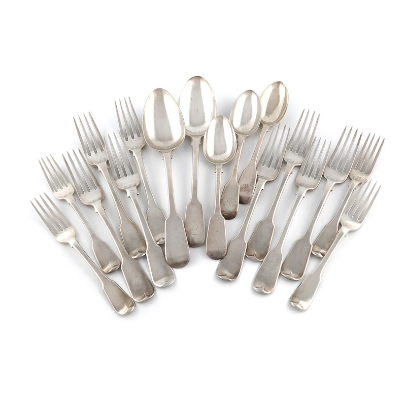 the reverse of the terminals with crests and monograms, comprising: eight table forks, four dessert forks, three dessert spoons and a pair of tablespoons, approx. weight 33oz. (qty)