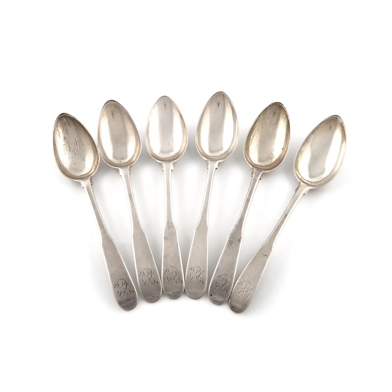 A set of six George III provincial silver Fiddle pattern dessert spoons