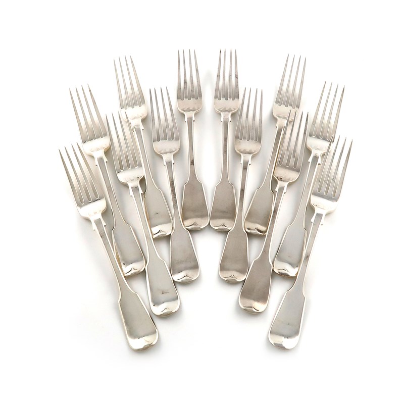 A matched set of twelve George IV/William IV silver Fiddle pattern table forks