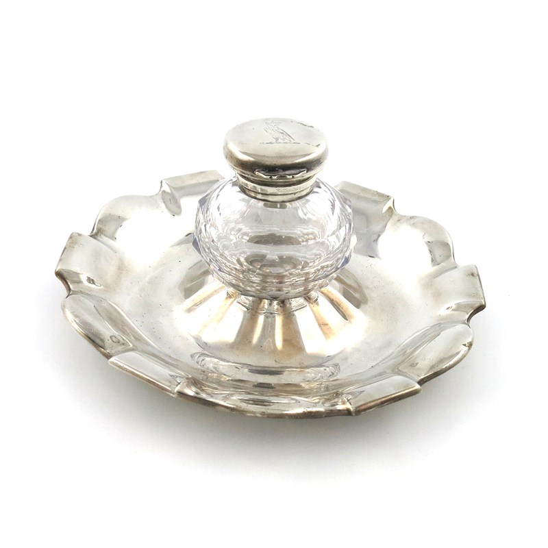 lobed circular form, the cut-glass inkwell with a hinged cover, crested, diameter 21cm, approx. weight 11.5oz.