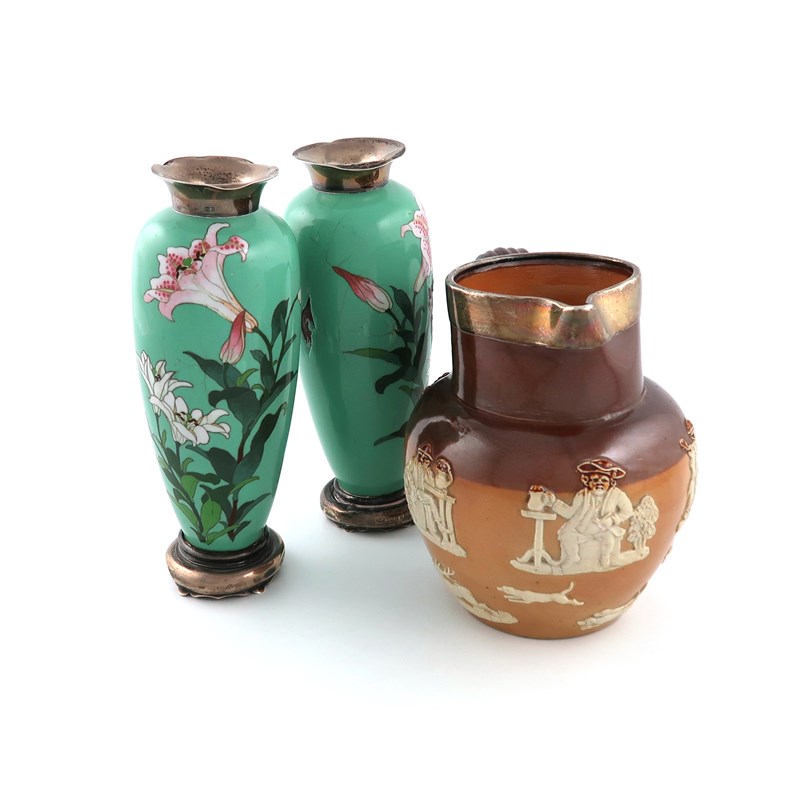 the tapering bodies enamelled with lilies on a turquoise ground, damage to enamel, plain mounts, circular bases, height 21cm, plus an Edwardian silver-mounted Doulton Harvest jug, London 1905, height 16.5cm. (3)