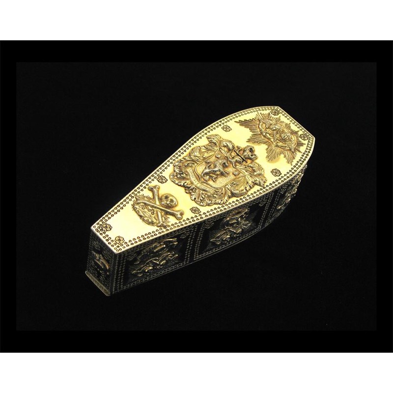 A rare George IV large silvergilt "memento mori" box, in the form of a coffin decorated with an applied coat of arms and skull and cross bones on the base and applied hinged putti masks and handles around the sides, further decorated with pellets to del???? panels and applied with a crest and the initials "LGN", the cover engine turned, by William Ellerby, London 1820, 5.15in (13cm), 7.2oz.
