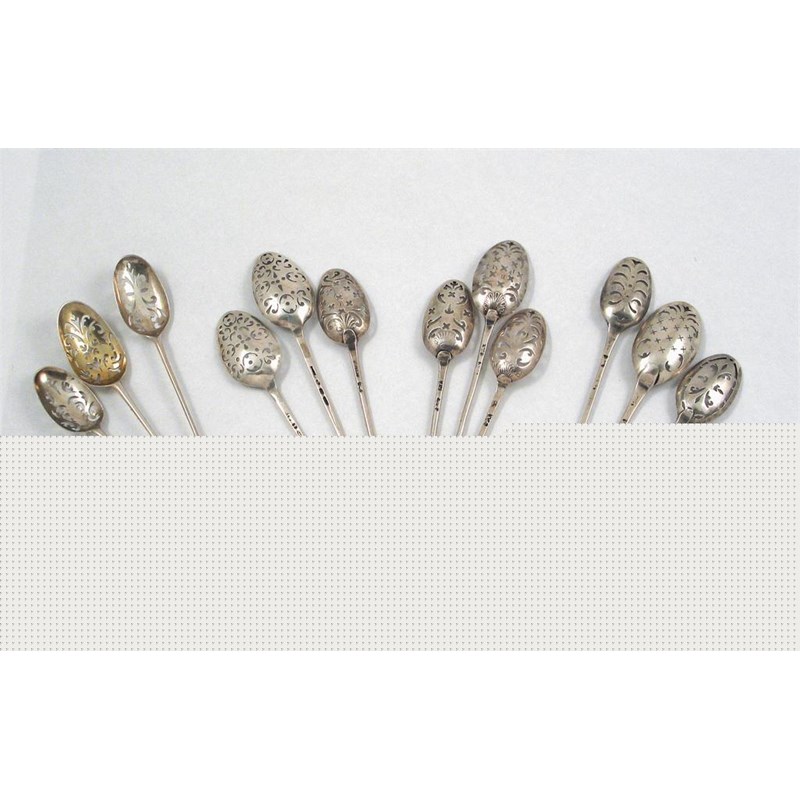 A George II silvergilt mote spoon, with decorative piercing and a doubledrop, marks distorted, London c.1750 together with an unmarked George I example with a wire stem, scroll piercing and a plain rattail and another similar with traces of a mark in the piercing. (3)