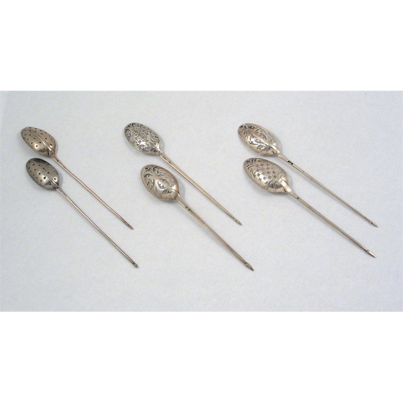 A George III mote spoon, pierced with scrolls, single drop and diamond point finial, maker's mark and lion passant only (unclear) c.1780, together with a George II example pierced with scrolls and crosslets and heightened by engraving, maker's mark [struck twice] "?S" in a heart-shaped punch, c.1735. (2)