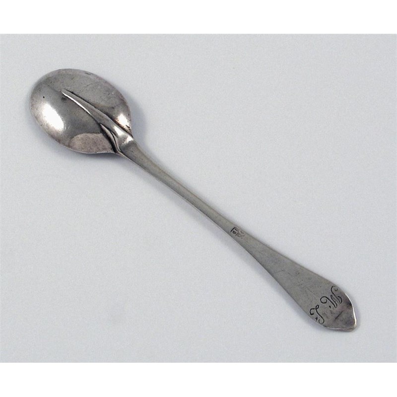 A Queen Anne/George I unascribed dognose tea/condiment spoon, initialled 'M.L', maker's mark only (O? over D) 1710-20, 4.35in (11.4cm) long.